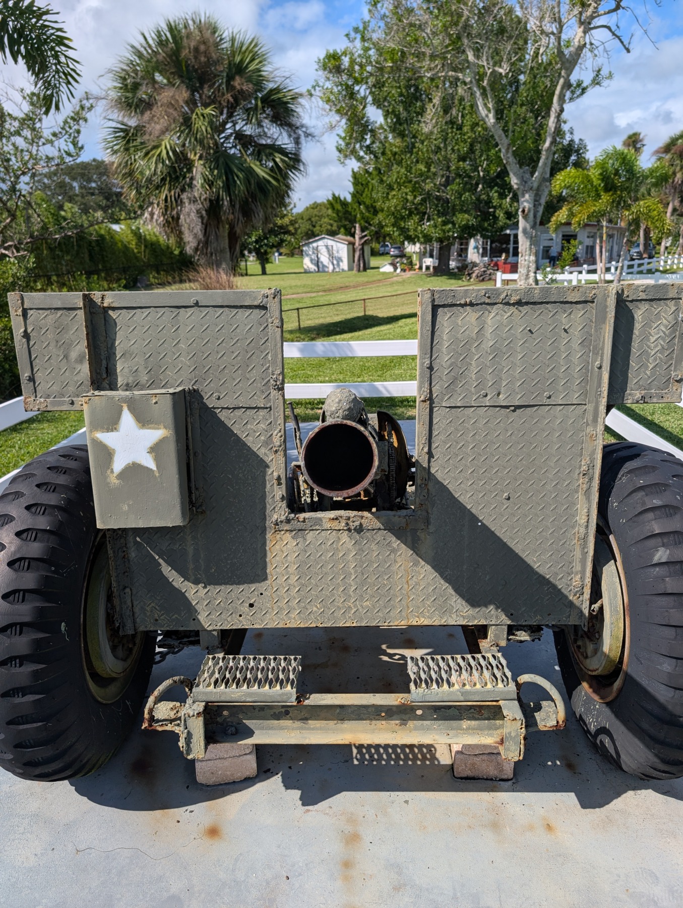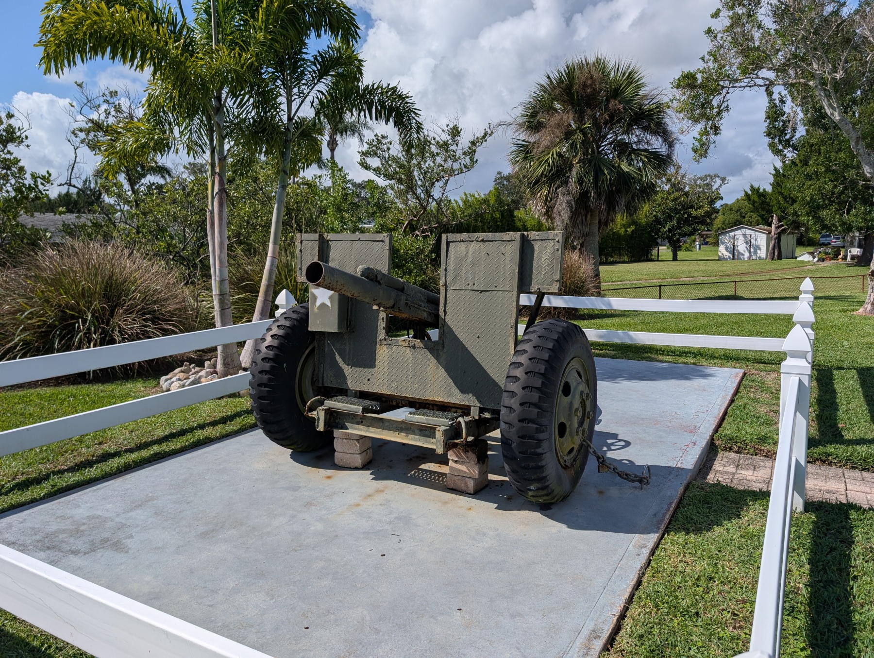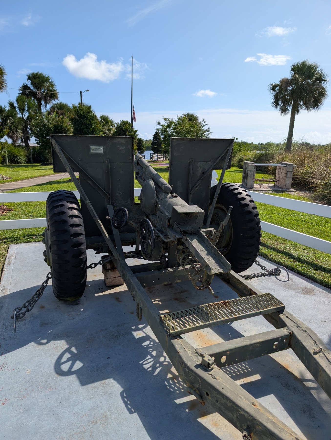 Veterans Park in Edgewater, Florida is a small park located just off Riverside Drive with the beautiful Indian River on the eastern edge. The park provides easy access to the walking trail located along Riverside Drive. Jutting into the River is a fishing pier providing free river access to anyone with a rod and reel. The small park contains two monuments with plaques along with retired military equipment that is in stark contrast to the peaceful neighborhood the